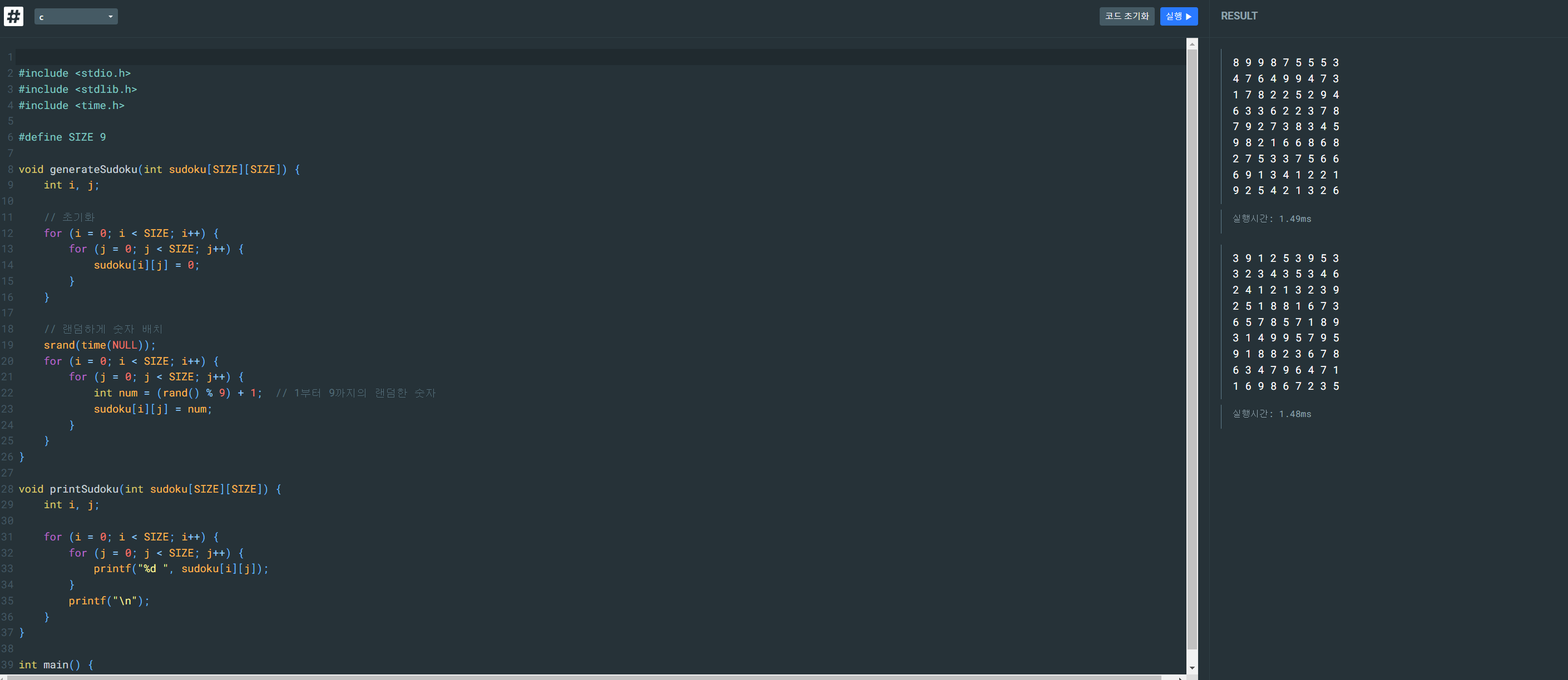 c언어 실행기를 통해 코드를 실행하여 결과를 도출 하였더니 스도쿠가 완성 되었다.